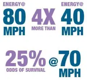 But a 70-mph crash involves 306% more kinetic energy than a 40-mph crash. In crash studies, when a car is in a collision at 300% of the forces it was designed to handle, the odds of survival drop to just 25%.