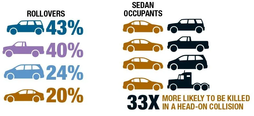 However, the percentage of fatalities in rollover crashes, where there may have been no collision with another car, was highest for SUV’s, at 43%, followed by pickup trucks, (40%), vans, (24%), and passenger cars at 20%.