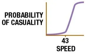 However, the odds of surviving a head-on crash drop exponentially at speeds above the 43-mph mark.